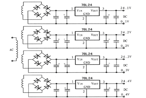 驅動電路需要4路相互隔離的直流電源為4路IGBT驅動電路供電,用220V/22V變壓器對4路交流電源分別整流,用電容器和78L24型電壓調整器穩壓後輸出4路24V直流電壓,如圖2所示。