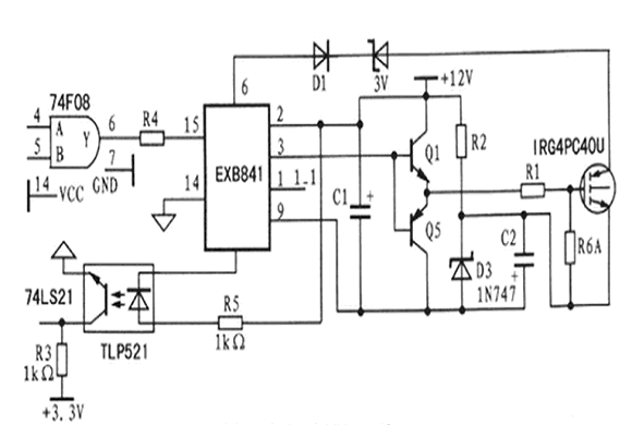 EXB841的6引腳連接的二極管可檢測IGBT的飽和壓降,用來完成過流保護功能,4引腳的過流保護信號延時10μs輸出。當IGBT有過流時,若UCE大於7.5V,內部過流保護電路開始動作,軟關斷IG-BT。通常在IGBT通過額定電流時UCE為3.5 V,當UCE=7.5 V時,IGBT有過流,其值約為額定電流的3~5倍,但是由於沒有達到保護的閾值,保護電路不起作用。如果長時間工作在這種狀態,則會導致IGBT損壞。為了可靠地保護IGBT,應該降低過流保護閾值,可以在D1與IGBT的集電極間反串一個穩壓管,或多串幾個與D1同規格的快速恢複二極管。如圖3通過反串一個IN4728型3.3 V穩壓管使保護閾值降為4.2V。當檢測到IGBT過流後,5引腳變為低電平,TPL521型光耦輸出低電平,通過與門封鎖控製信號輸入,同時使4輸入與非門輸出低電平,觸發功率驅動保護中斷,完成相應的保護處理。