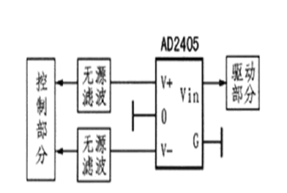 控製電路為弱電部分,極易受到幹擾;驅動電路直接與外電路連接,是一個較強的幹擾源;為wei了le實shi現xian整zheng個ge設she備bei的de電dian磁ci兼jian容rong,控kong製zhi電dian路lu部bu分fen必bi須xu與yu驅qu動dong部bu分fen隔ge離li。為wei了le避bi免mian公gong共gong電dian源yuan對dui控kong製zhi電dian路lu產chan生sheng幹gan擾rao,應ying對dui控kong製zhi電dian路lu及ji驅qu動dong電dian路lu分fen別bie供gong電dian,EXB84l的電源電壓為+20 V,一般控製電路的供電電壓為5 V,因此,可以利用圖4所示的DC-DC微功率模塊進行電源隔離,采A2405D型微功率模塊實現電源的隔離。