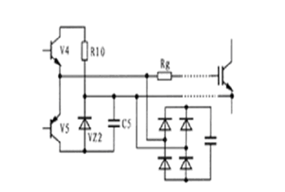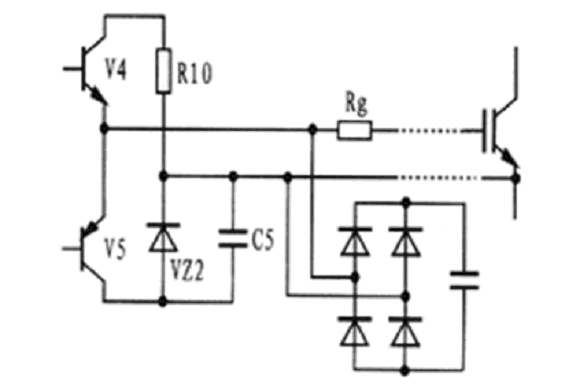圖5所示為EXB841與IGBT柵-射極之間的連接電路原理圖。當驅動電路中的V4導通時,IGBT處於正常導通狀態,當V5導通時,IGBT柵-射極之間通過穩壓管VZ2提供一個-5V電壓加在其兩端,使IGBT關斷,此時V5處於臨界導通狀態,穩壓管VZ2處於反向偏置狀態。但由於集-柵極之間分布電容的影響,集-柵極之間的du/dt增大時,其通過分布電容形成的電流經過,所以,要克服集-柵極之間的du/dt,確保穩壓管不過壓,避免IGBT誤導通。克服du/dt的方法有二種:一是驅動電路輸出與IGBT柵-射極之間的連線采用雙絞屏蔽電纜,屏蔽層接地,二是采用快速吸收電路吸收過電壓。