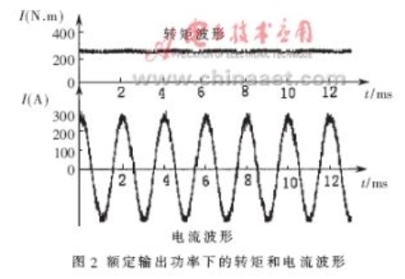 電機額定功率為57kW,額定轉矩為270N•m,額定轉速為2000r/min,額定端電壓為230V。變頻器係統參數根據使用的電機進行匹配。在額定功率下運行時的轉矩和電流波形如圖2所示。