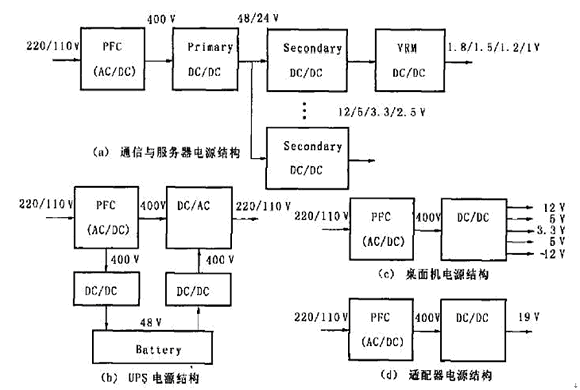 圖1(c)是桌麵機(例如個人電腦)的電源結構。先由PFC電路將市電變換成400V 的直流電壓,再經過一個多路輸出的DC/DC 變換成多路的較低的直流電壓給不同負載供電。 圖1(d)是筆記本電腦適配器的電路結構。 首先由PFC 將市電變換成400V的直流電壓,然後經過一個DC/DC變換器降壓至19V(典型值)給負載供電。
