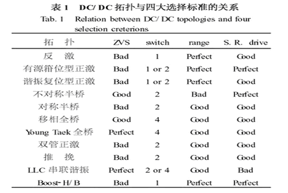 非隔離型的DC/DC 拓撲結構並不多,通常根據電壓的升降要求以及簡單性原則就可以比較容易確定最佳方案。 所以下麵的標準主要是針對隔離型的DC/DC。 此外,標準的量化是建立在目前元器件的水平上。 隨著元器件的發展,這些標準的量化也是動態發展的;再者,電源輕小化是目前主流電源追求的重要指標,輕小化體現在電力電子線路上就是要求高頻化。 所以下麵的標準也是建立在電源體積要盡量小的前提上。
