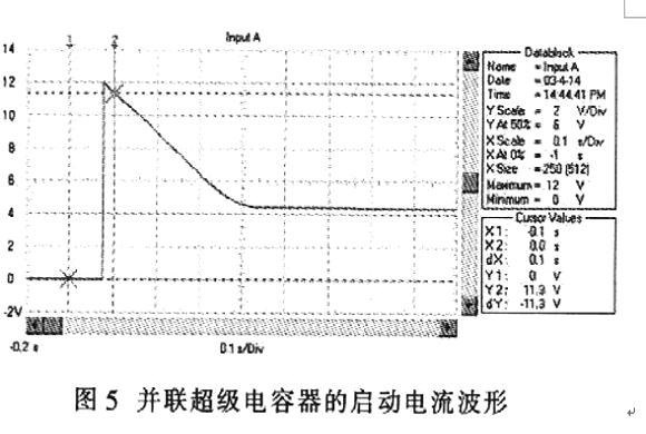 超級電容器">電容器與蓄電池並聯時,汽車啟動過程的電壓波形如圖4所示,電流波形如圖5所示。與圖1和圖2相比,啟動瞬間電壓跌落由隻采用蓄電池時的3.2V提升到7.2V;啟動電流從560 A提高到l200 A;啟動瞬時的電源輸出功率從2 kW上升到8.7kW;啟動過程的平穩電壓由7 V提高到9 .4 V;啟動過程的平穩電流由280 A提高到440 A;啟動過程的電源平穩輸出功率從2.44 kW提高到4.12 kW。