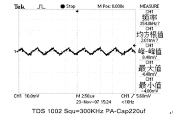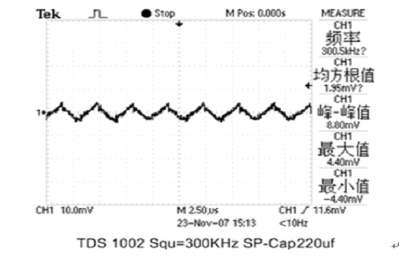 現分別用1隻2V/220μF PA-Cap或2V/220μF鬆下公司聚合物固體疊層鋁電解電容器(SP-Cap)接在輸出電容Cout位置,測試其濾波效果。輸出波形如圖4和圖5所示: