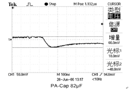當MPU的負載電流急劇增大時,由於PA-Cap的ESR比普通鉭電容小很多,所以接上PA-Cap的電源電壓下降隻有66mV比普通鉭電容小好幾倍(如圖10、11所示),達到良好的去耦效果。PA-Cap不僅去耦效果好,而且不燃燒不爆炸,是MPU等數字電路作為高速保護備用電荷庫的優選電容之一。