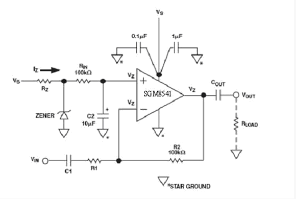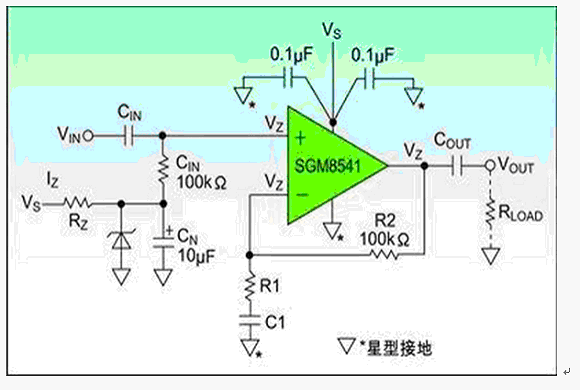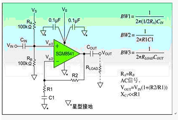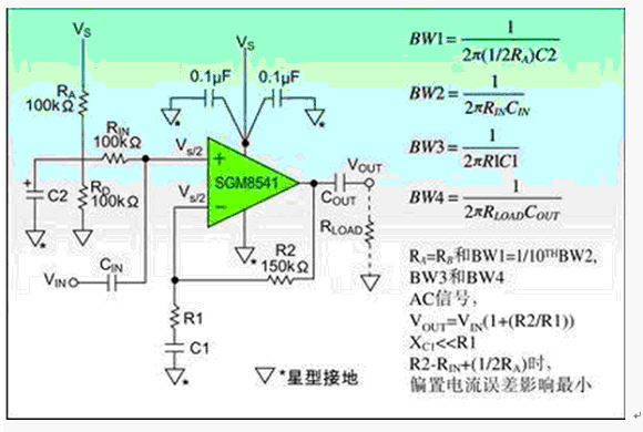 首先,電路的電源抑製幾乎沒有,電源電壓的任何變化都將直接通過兩個分壓電阻改變偏置電壓Vs/2,但電源抑製的能力是電路非常重要的特性。例如此電路的電源電壓1伏的變化,能引起偏置電路電壓的輸出Vs/2變化0.5伏。該電路的電源抑製僅僅隻有6dB,通過選用SGM8541運算放大器可以增強電源抑製能力。