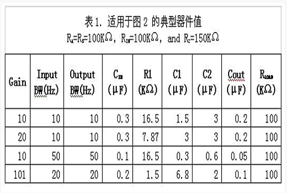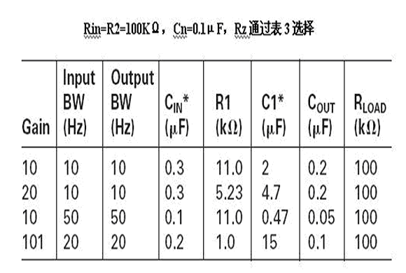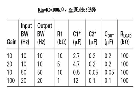 設計單電源運算放大器電路,需要考慮輸入偏置電流誤差、電源抑製、增益、以及輸入與輸出線路帶寬等等。然而普通的應用設計是可以通過查表來獲得,見表1。在單電源電壓為15V或12V時偏置分壓的兩個電阻通常選用100kΩ,這樣可以在電源消耗與輸入偏置電流誤差之間合理的折中。5V單電源偏置分壓電阻減小到一個比較低的值,例如42kΩ。還有些在3.3V應用中偏置分壓電阻選在27kΩ左右。