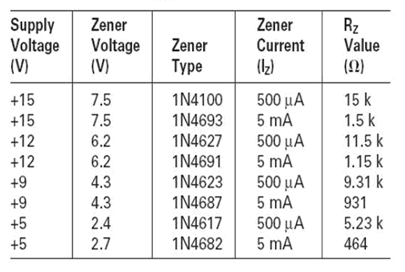 表2:電路圖3和4的一些齊納二極管與Rz電阻值的關係