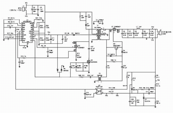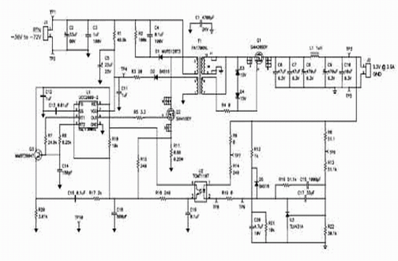 圖 3 顯示了傳統同步反向電源設計的完整原理圖。該設計使用了一個低成本、簡化的電流模式 PWM 控製器(即 UCC2809),對電源進行控製。除了主緩衝器以外,該電路還需要D3 和 D4 的齊納鉗位電路,以防止來自漏極電感峰值的 Q1 超高柵-源電壓。