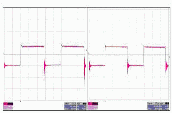 如圖 6 所(suo)示(shi),您(nin)可(ke)以(yi)通(tong)過(guo)變(bian)壓(ya)器(qi)二(er)次(ci)級(ji)電(dian)壓(ya)對(dui)這(zhe)兩(liang)種(zhong)設(she)計(ji)進(jin)行(xing)更(geng)多(duo)的(de)區(qu)分(fen)。表(biao)麵(mian)看(kan)來(lai),這(zhe)兩(liang)個(ge)波(bo)形(xing)極(ji)為(wei)相(xiang)似(si)。進(jin)一(yi)步(bu)檢(jian)查(zha)的(de)話(hua),您(nin)就(jiu)會(hui)發(fa)現(xian)傳(chuan)統(tong)同(tong)步(bu)反(fan)向(xiang)電(dian)源(yuan)的(de)負(fu)振(zhen)鈴(ling)要(yao)比(bi)有(you)源(yuan)鉗(qian)位(wei)反(fan)向(xiang)電(dian)源(yuan)的(de)負(fu)振(zhen)鈴(ling)嚴(yan)重(zhong)很(hen)多(duo)。該(gai)振(zhen)鈴(ling)是(shi)由(you)同(tong)步(bu) FET 關閉延遲引起的,通常出現在主 FET 轉換開啟的時候。請注意,同步 FET 的柵-源關閉電壓與反向次級繞組電壓相同。在變壓器次級電壓變為負值的同時,同步 FET 必須完全關閉(實現這一操作比較困難),否則就會出現直通現象。控製器驅動的柵極驅動信號有源鉗位設計確保了同步 FET 在主 FET開啟之前被關閉,並減少了電壓振鈴。這也影響了對同步 FET 的選擇。與傳統的同步反向電源相比較,有源鉗位設計可以使用一個帶有更低 Rdson 的緩同步 FET。由於 FET 主體二極管的反向恢複,有源鉗位的同步 FET 上仍然會出現少許振鈴現象。