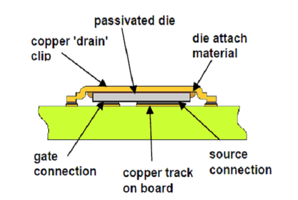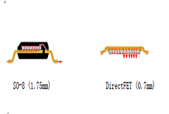傳統的MOSFET使用引線鍵合來實現矽片和管腳框架之間的電連接,而DirectFET,將接觸麵的數目和傳導路徑的長度減到最小從而減小了傳導損耗。