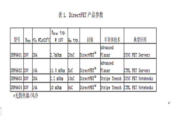 最先使用DirectFET封裝的器件是20 V和30V的同步降壓變換器芯片組,用做調整管和同步管(表1)。