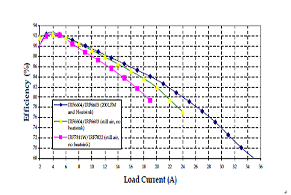 在一個12V輸入,1.3V輸出,工作頻率300kHZ的同步降壓變換器中,我們將IRF6603/IRF6604和IRF7822/IRF7811W這兩對管子做以比較,它們使用的矽片技術是相同的。負載電流增加時,此變換器電路板的溫度不得超過105°C。當電流達到18A時,這是SO8封裝在無冷卻氣流的條件下能夠承受的大電流,IRF6603的結溫要低50°C。比較DirectFET和SO-8在靜止空氣無散熱器條件下的效率曲線,在18A時前者的效率要高出3%。