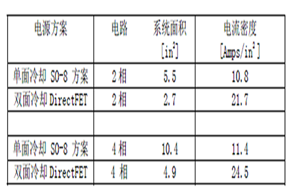 為了計算方便,假設單麵冷卻的器件被限製在0.5 in2 的PCB板內,我們知道設計者往往用到1in2 以盡可能增加SO8的輸出電流。DirectFET器件布置在最小的管腳尺寸內。下表給出了論證結果,表明在大電流DC-DC變換器中,雙麵散熱的DirectFET的電流密度能比單麵散熱的SO8的增加一倍。