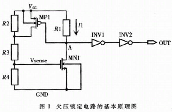 欠壓鎖定電路的基本原理圖如圖1所示。電路包括電壓采樣電路、比較器、輸出緩衝器和反饋回路。Vcc為待檢測的電源電壓,電阻R2、R3、R4組成Vcc的分壓采樣電路,實現對Vcc的采樣;NMOS開關管MNl和電阻R1構成比較器,對采樣電壓和MNl的VTH進行比較,並輸出比較結果;反向器INV1和INV2組成緩衝器電路,可對比較器的輸出波形進行整形和緩衝,提高電路的負載能力;PMOS開關管MP1構成正反饋回路,可以實現電路的遲滯功能,防止電路在Vcc的閾值附近振蕩,增加係統的穩定性。調整R2、R3、R4的大小可實現不同閾值和遲滯量的Vcc欠壓保護。