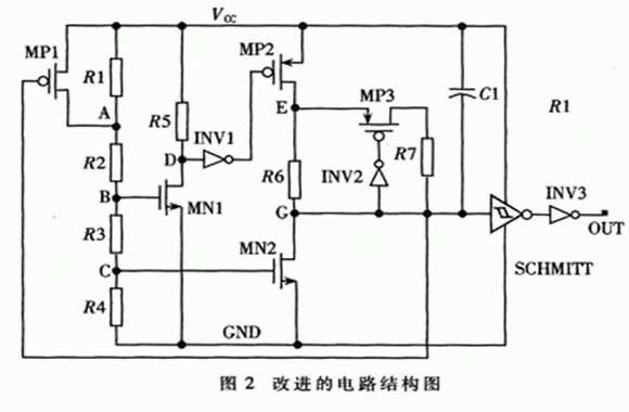 如圖2所示,改變電阻R3的大小,可以調整MN1和MN2導通和截止的時間次序。為了降低R5、MN1的功耗,應增大R5的阻值,減小MN1的W/L,使流過MN1和R5的電流很小。為了減小MN1和MN2製造工藝的不匹配問題,要求MN2由若幹個與NN1相同的NMOS管並聯構成。