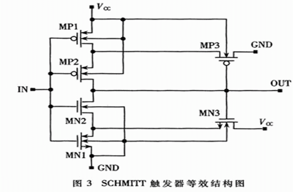 改進的電路如圖2所示,電路結構由采樣、先導控製、比較器、遲滯反饋回路、加速響應電路、緩衝器六部分構成。電阻R1、R2、R3、R4構成分壓電阻網絡實現對Vcc的采樣;MNl、R5、INVl組成先導控製電路,實現對比較器灌電流的控製;MN2、R6、MP2組成比較器,實現采樣電壓與MN2的VTH比較;MP1構成正反饋回路,可實現Vcc的遲滯功能;INV2、MP3、R7構成正反饋回路,可加速比較器的翻轉,從而提高電路的響應速度;SCHMITT觸發器和INV3是緩衝電路,對比較器的輸出波形進行緩衝和整形,SCHMITT觸發器的結構如圖3所示,其工作原理詳見參考文獻[3];另外,電容C1起濾波和儲能作用。