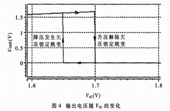從圖4的仿真的波形中可以看出:當增大電源電壓時,電壓低於1.7V為欠壓鎖定;當減小電源電壓時,電壓低於1.65V為欠壓鎖定。仍可進一步調整參數,以改變電源電壓欠壓閾值。