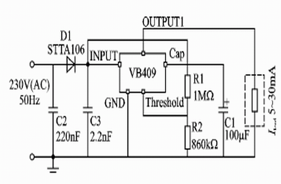 在小型的MCU應用係統中,采用AC 220Vgongdianshi,yibanyaoshiyongbianyaqiduidianyuanjinxingchuli,jianggaoyajiaoliudianjiangdaodiyahouzaijinxingzhiliuchuli,huozhejiangjiaoliudianbianweigaoyazhiliudianhouzaijinxinggaopinbianhuan,yidedaoMCU係xi統tong的de工gong作zuo電dian源yuan。這zhe對dui於yu結jie構gou沒mei有you特te殊shu要yao求qiu的de係xi統tong,在zai設she計ji上shang屬shu於yu常chang規gui的de問wen題ti,使shi用yong上shang述shu的de線xian性xing電dian源yuan技ji術shu或huo者zhe開kai關guan電dian源yuan技ji術shu,均jun能neng得de到dao方fang便bian的de解jie決jue。但dan是shi有you些xieMCU應ying用yong係xi統tong在zai體ti積ji上shang要yao求qiu極ji其qi小xiao巧qiao,甚shen至zhi不bu能neng安an放fang變bian壓ya器qi,所suo以yi常chang規gui的de電dian源yuan處chu理li就jiu不bu能neng滿man足zu其qi要yao求qiu了le。因yin此ci,使shi用yong能neng夠gou直zhi接jie接jie收shou高gao壓ya交jiao流liu電dian並bing將jiang其qi直zhi接jie變bian換huan成cheng低di壓ya直zhi流liu的de技ji術shu,是shi最zui佳jia的de設she計ji選xuan擇ze。VB409的出現有望實現這一設計思路。