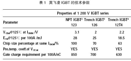 英飛淩的3 個主要IGBT 技術係列的最重要的專用參數如表1 所列,它們都為1 200 V SEMI原TRANS模塊所使用。