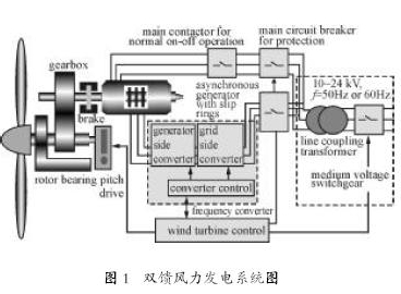 當風力發電機轉速發生變化時,通過轉子側變頻調速裝置調節轉子電流頻率f2,保證f1恒定不變,實現風力發電機的變速恒頻控製。