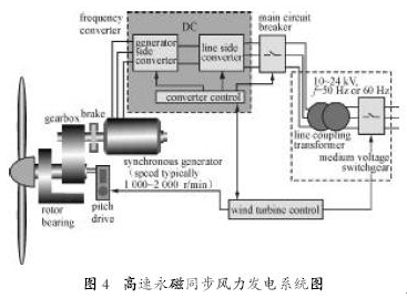 該係統機械結構與雙饋型基本相同,沒有了繞線式電機滑環所帶來的弊病,且發電機重量輕,發電效率高,。通常電機的極數為6 或8 極,發電機的轉速一般為1 000~2 000 r/min,ABB變頻器典型功率範圍為1~5 MW,結構如圖4所示。