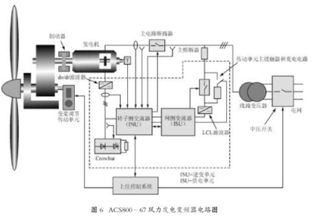 ACS800-67 風力發電變頻器主要和帶有轉子繞組和滑環的感應式發電機一起使用,連接於雙饋發電機轉子和電網之間,電路圖如圖6所示。該變頻器既可以安裝在塔基處也可以安裝於發電機艙內。