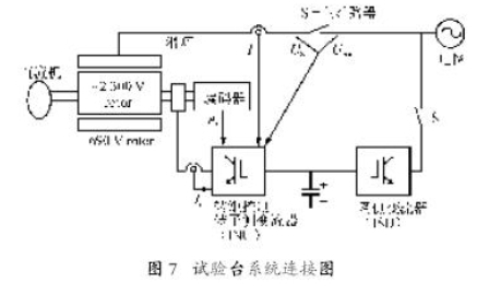 上海南洋電機廠采用ACS800-67 變頻器構建雙饋風力發電機的實驗平台,風力機采用直流電動機模擬,即雙饋發電機轉子靠直流電動機拖動。係統連接示意圖如圖7所示。技術數據如下:發電機定子額定電壓690 V,定子額定電流1500A,額定頻率50 Hz,額定功率1 345kW,額定轉速1 513 r/min,同步轉速1 500 r/min,功率因數0.9,轉子開路電壓1990V,轉子電流550A;變頻器型號ACS800-67-0480/0770-7,調速範圍±30%。