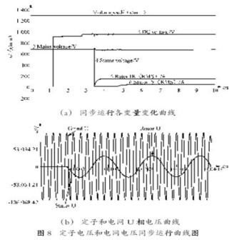 圖8(b)所示為電網U 相電壓與定子U 相電壓在同步過程中的變化曲線。由圖可知,當變頻器投入運行後,定子U 相電壓迅速建立,並與電網U 相電壓在相位、幅值上完全一致,達到同步的要求。