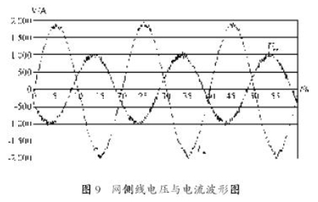 圖9 為發電機處於超同步運行(轉子轉速為1 513 r/min),給定轉矩為額定轉矩的85%,無功功率給定為零時,電網線電壓、相xiang電dian流liu的de波bo形xing圖tu。理li論lun分fen析xi可ke知zhi,當dang發fa電dian機ji處chu於yu超chao同tong步bu運yun行xing狀zhuang態tai,發fa電dian機ji的de定ding子zi側ce和he轉zhuan子zi側ce應ying同tong時shi向xiang電dian網wang輸shu出chu電dian能neng,網wang側ce相xiang電dian流liu為wei定ding子zi與yu轉zhuan子zi的de電dian流liu之zhi和he。通tong常chang網wang側ce變bian流liu器qi的de無wu功gong功gong率lv給gei定ding設she置zhi為wei零ling,所suo以yi定ding子zi與yu轉zhuan子zi電dian流liu的de相xiang位wei相xiang同tong,都dou與yu電dian網wang電dian壓ya反fan相xiang。實shi際ji上shang,由you圖tu可ke知zhi,電dian網wang相xiang電dian壓ya與yu定ding子zi電dian流liu相xiang位wei相xiang差cha180°,完全反相,發電機處於發電狀態,向電網輸出電能,功率因數為-1。