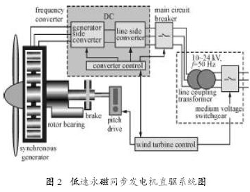 低速永磁同步發電機直驅係統主要由低速永磁同步發電機+全功率變頻器構成,如圖2所示。ABB發電機典型功率範圍為600~5 000 kW。