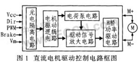 直流電機驅動控製電路分為光電隔離電路、電機驅動邏輯電路、驅動信號放大電路、電荷泵電路、H橋功率驅動電路等四部分,其電路框圖如圖1所示。