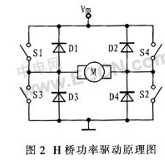 直流電機驅動使用最廣泛的就是H型全橋式電路,這種驅動電路方便地實現直流電機的四象限運行,分別對應正轉、正轉製動、反轉、反轉製動。H橋功率驅動原理圖如圖2所示。
