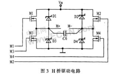 相對來說,利用2個N溝道功率MOSFET和2個P溝道功率MOSFET驅動電機的方案,控製電路簡單、成本低。但由於加工工藝的原因,P溝道功率MOSFET的性能要比N溝道功率MOSFET的差,且驅動電流小,多用於功率較小的驅動電路中。而N溝道功率MOSFET,一方麵載流子的遷移率較高、頻率響應較好、跨導較大;另一方麵能增大導通電流、減小導通電阻、降低成本,減小麵積。綜合考慮係統功率、可靠性要求,以及N溝道功率MOSFET的優點,本設計采用4個相同的N溝道功率MOSFET的H橋電路,具備較好的性能和較高的可靠性,並具有較大的驅動電流。其電路圖如圖3所示。圖中Vm為電機電源電壓,4個二極管為續流二極管,輸出端並聯一隻小電容C6,用於降低感性元件電機產生的尖峰電壓。