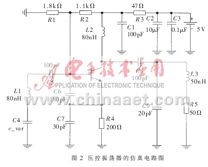 式中,L1為線圈繞製電感,Q值為39。C為C4、C5、C6和C7串聯後的等效電容,由於C4<<C5、C4<<C6、C4<<C7,所以C≈C4。其中,C4為變容管,通過改變其負偏壓就可以改變振蕩頻率。
