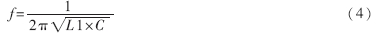 交流等效電路如圖3所示。L1、C4和C5串聯可以等效成一個電感,從而滿足電容三端振蕩器的相位條件。L1、C4、C5、C6、C7構成了諧振回路,振蕩頻率主要由這五個元件所決定。頻率計算公式如下: