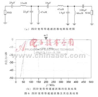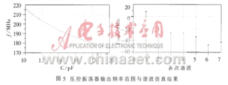 從圖5可以看出,壓控振蕩器的輸出頻率範圍為175MHz~217MHz,基波(頻率為214MHz時)輸出功率為7.911dBm,二次諧波為-16.368dBm,可見有效地抑製了諧波分量。在實際應用中,對諧波濾除的要求比較高,可以在輸出端接入寬帶濾波器,其電路原理圖和仿真結果見圖6。這樣,可以更有效地濾除高次諧波,同時有利於輸出匹配,減小負載對輸出功率的影響。