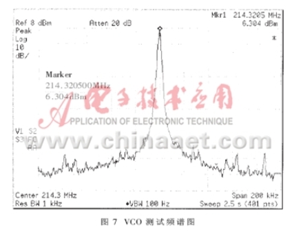 式中,fm為頻偏,KVCO為VCO控製靈敏度,fo為振蕩頻率,Q為品質因數,F為晶體管的噪聲係數,K為波爾茲曼常數,T為工作溫度,Ps為振蕩信號功率,fc為閃爍噪聲拐角頻率,Vm為低頻噪聲源的總幅度。從式(5)可以看出,選擇噪聲係數小的放大管、增加諧振回路有載Q值、減小VCO控製靈敏度、提高輸出信號功率都可以降低相位噪聲。通過減小變容管在諧振回路中的接入係數,可以有效減小VCO控製靈敏度,但是也會導致頻率覆蓋範圍的減小,所以要適當選擇接入係數。該VCO輸出頻率為200MHz時,變容管接入係數為0.63。通過適當調整輸出回路的電感和分壓電容,可以提高負載阻抗,從而有效地提高輸出功率,以達到降低相位噪聲的目的。通過軟件仿真,在頻偏10kHz處的輸出相位噪聲為-101.3dBc/Hz,在100kHz處的相位噪聲為-122.5dBc/Hz。