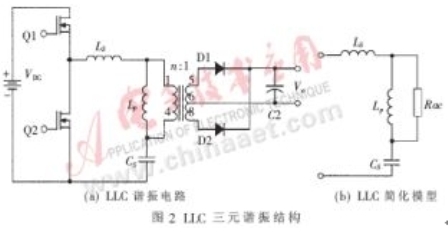 在zai二er元yuan件jian諧xie振zhen網wang絡luo的de基ji礎chu上shang,根gen據ju不bu同tong的de應ying用yong可ke構gou建jian不bu同tong種zhong類lei的de三san元yuan件jian的de諧xie振zhen網wang絡luo。三san元yuan件jian諧xie振zhen網wang絡luo與yu二er元yuan件jian諧xie振zhen網wang絡luo相xiang比bi有you很hen多duo優you點dian,比bi如ru在zai全quan負fu載zai範fan圍wei內nei都dou具ju有you較jiao高gao的de轉zhuan換huan效xiao率lv,而er且qie頻pin率lv變bian化hua範fan圍wei比bi較jiao窄zhai等deng。本ben文wen主zhu要yao介jie紹shao和he分fen析xi由you三san元yuan件jianLLC構成的諧振網絡,其結構如圖2(a)所示。