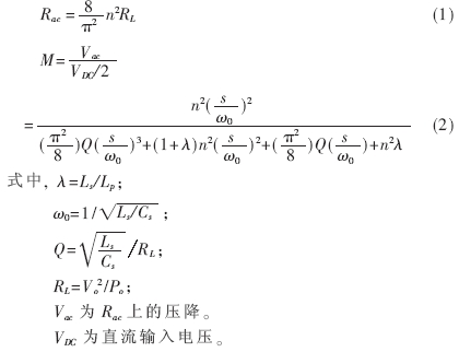 串聯電感Ls、並聯電感Lp和諧振電容Cs組成LLC諧振網絡,在此必須注意到負載也參與了諧振。對其進行建模,LLC簡化模型如圖2(b)所示,Ra c為副邊的負載折算到原邊的等效負載,折算公式見式(1)。因yin為wei原yuan邊bian輸shu入ru電dian壓ya為wei方fang波bo,電dian流liu為wei近jin似si正zheng弦xian波bo,而er變bian壓ya器qi輸shu出chu電dian壓ya也ye是shi方fang波bo,電dian流liu也ye是shi正zheng弦xian波bo,因yin此ci可ke以yi推tui導dao出chu其qi電dian壓ya傳chuan遞di函han數shu,如ru式shi(2)所示。