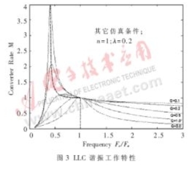 從圖3中可以看到,在整個頻率範圍內,既有降壓的工作區域(M<1),也有升壓的工作區域(M>1),因此LLC諧振有著較為廣闊的應用範圍。在輕負載時,工作頻率逐漸升高,工作在降壓區域內;而在重負載時,工作頻率逐漸降低,工作在升壓區域內。眾所周知,串聯諧振的工作區域是Fs/Fo>1,才能工作在ZVS的狀態下。從圖3中可以看到,在不同負載(即Q不同)下,為獲得ZVS的工作條件,隻要使之工作在虛線的右側即可。而LLC諧振不僅僅局限於Fs/Fo>1區域,在某些負載下可以工作在Fs/Fo<1區域,同樣可以獲得零電壓轉換的工作狀況。並且與串聯諧振相比,在不同負載時的頻率變化範圍更小。因此,LLC諧振網絡有著其自身獨特的優點。