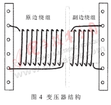 通過上麵的分析知道,LLC諧振網絡需要兩個磁性元件Ls和Lp。然而,在實際應用中,考慮到高頻變壓器實際結構,可以把磁性元件Ls和Lp集成在一個變壓器內,利用變壓器的漏感作為Ls,利用變壓器的磁化電感作為Lp。這zhe樣yang一yi來lai,可ke以yi大da大da減jian少shao磁ci性xing元yuan件jian數shu目mu。在zai設she計ji時shi,隻zhi要yao重zhong點dian設she計ji變bian壓ya器qi的de漏lou感gan與yu變bian壓ya器qi磁ci化hua電dian感gan即ji可ke。因yin此ci,為wei增zeng加jia漏lou感gan,需xu要yao在zai變bian壓ya器qi中zhong加jia入ru適shi當dang的de氣qi隙xi,並bing且qie控kong製zhi變bian壓ya器qi原yuan副fu邊bian的de繞rao線xian方fang式shi,如ru圖tu4所示。因為變壓器的原邊繞組與副邊繞組是完全分離的,因此無須使用隔離膠帶,這樣有助於形體的小型化。