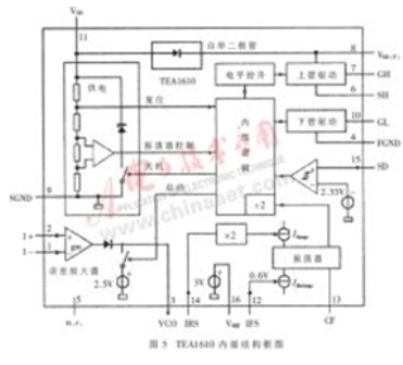 TEA1610是Philips公司推出的零電壓全諧振半橋控製器,是采用高壓DMOS工藝的芯片,高側開關管的驅動耐壓最大可達600V,最大的振蕩頻率達1MHz。其內部結構如圖5所示。