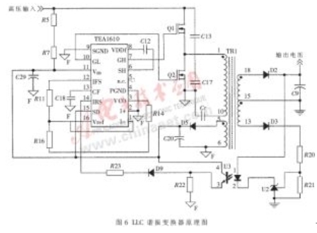 TEA1610內部具有電平抬升電路,可以直接驅動上橋開關管;具有一個電流控製的振蕩器,用來產生精確的振蕩頻率;為精確保證50%占空比,振蕩信號是在經過觸發器後送到開關管的驅動極;內部具有死區補償電路,通過外部電路可以控製死區時間;它還有一個關斷管腳SD,當該管腳上的電壓超過2.33V時,TEA1610進入關機模式,切斷開關信號。此時,隻能使VDD的電平低於5.3V才能重新啟動。因此,可以利用該管腳添加一些保護電路。