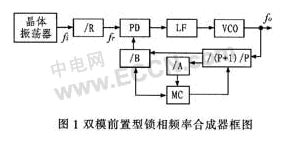 圖1中,(P+1)/P為高速雙模前置分頻器,分頻模數為P+1和P;A為吞脈衝可編程計數器;B為主可編程計數器;MC為模控製邏輯電路。其分頻比為N=(P+1)A+P(B-A)=PB+A (1)