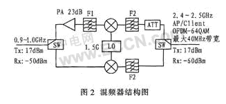 高(gao)性(xing)能(neng)的(de)本(ben)振(zhen)信(xin)號(hao)是(shi)影(ying)響(xiang)混(hun)頻(pin)器(qi)輸(shu)出(chu)頻(pin)譜(pu)純(chun)度(du)的(de)主(zhu)要(yao)因(yin)素(su)。利(li)用(yong)鎖(suo)相(xiang)環(huan)頻(pin)率(lv)合(he)成(cheng)技(ji)術(shu)設(she)計(ji)的(de)本(ben)振(zhen)源(yuan)能(neng)為(wei)混(hun)頻(pin)電(dian)路(lu)提(ti)供(gong)性(xing)能(neng)良(liang)好(hao)的(de)本(ben)振(zhen)載(zai)波(bo)。在(zai)WLAN中,混頻器需將來自AP的2.4 GHz的信號下變換到950 MHz,以使信號能在特定的電纜上傳輸。混頻器結構圖如圖2所示。ADF4360-4產生1.5 GHz的本地振蕩器(LO),混頻器采用AD8343,F1為900 MHz~1000 MHz的帶通濾波器。F2為24 GHz~2.5 GHz的帶通濾波器。PA的信號功率較大,超過AD8343門限,必須衰減,ATT為衰減網絡。