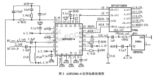 圖3是利用ADF460-4作為混頻器本振的外圍電路。外部晶體振蕩器為20 MHz,具有高穩定性。該晶體振蕩器不僅為ADF4360-4提供參考頻率,還為控製ADF4360-4的FPGA器件提供時鍾。晶體振蕩器接ADF4360-4的參考時鍾輸入引腳CLK_ref,在內部電荷泵輸出引腳CP和VCO輸出引腳VTUNE之間接入環路濾波電路。