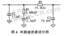 三階環路濾波電路如圖4所示,PFD的相位檢測頻率fr=200 kHz,相位裕量φp=45°,由於外接晶體振蕩頻率源為20 MHz,所以計算出參考分頻比N=100,利用ADI公司提供的ADIsimPLL工具計算三階環路濾波器參數:R1=9.46 kΩ,C1=173 pF,C2=2.36 nF,R2=19.3 kΩ,C3=79 pF。