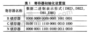 主分頻比N=1.5 GHz/200 kHz=7 500 。需要注意的是:雙模前置分頻器(P/P+1)輸出頻率要求小於300 MHz。因此選擇P/P+1=16/17,根據N=BF+A(A、B為整數),得到A=12,B=468。3個24位鎖存器的初始化設置如表1所示。